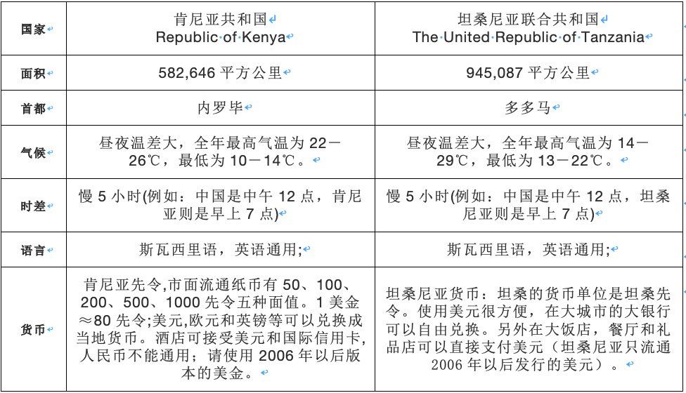 肯尼亚电压为 220V, 坦桑尼亚电压为 230 伏, 插座为英式三眼方头,出团前最好自带一个转换插座。