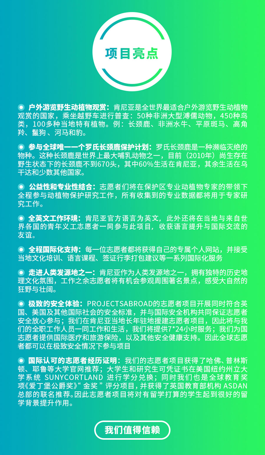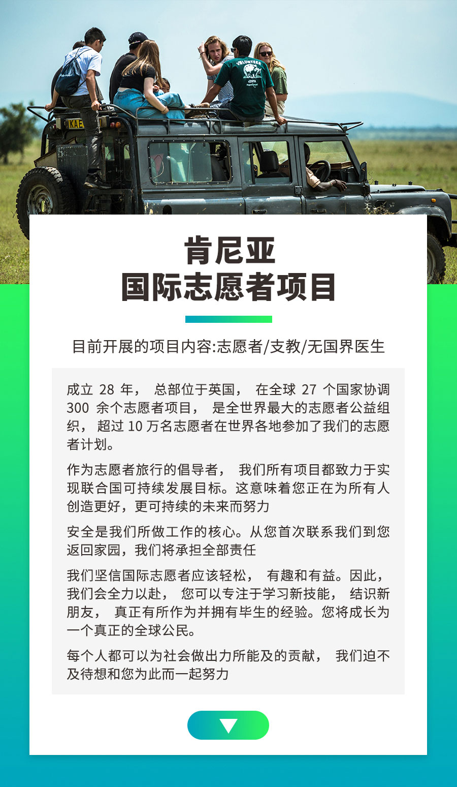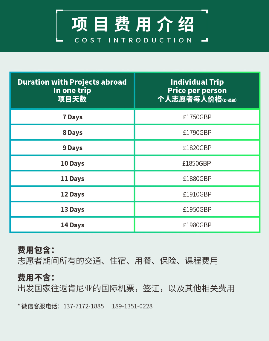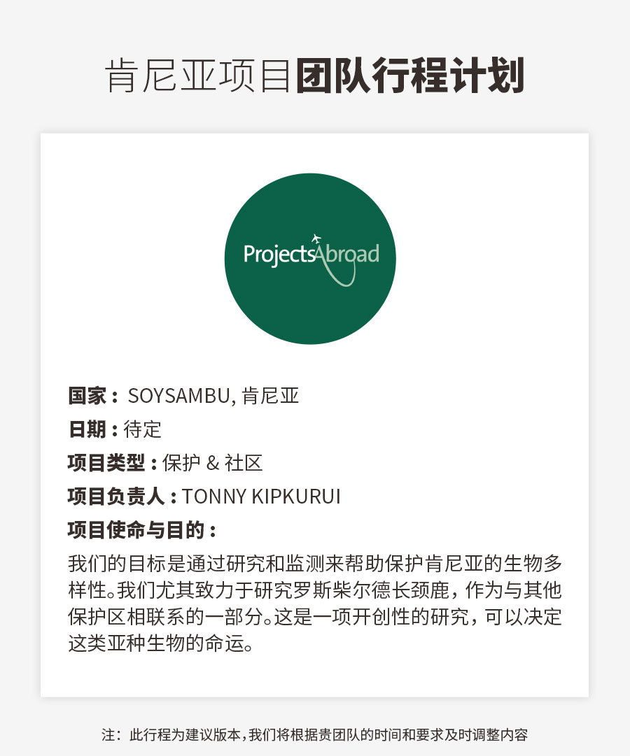 3月202020产品详情定制游真正的志愿者全球最大的志愿者机构在肯尼亚开展的野生动物保护项目,提供志愿者工时证明,可兑换美国大学学分,优秀志愿者更可得到推荐信得到欧美名校的入学加分 Categories: 产品详情, 定制游sinoafrica03/20/2020 作者: sinoafrica 文章导航历史的文章历史的文章:去肯尼亚,怎么能少了这份看动物攻略未来的文章未来的文章:【5钻】肯尼亚5大国家公园2大湖泊12日深度之旅Related Posts【5钻】坦桑尼亚大迁徙亲子之旅03/25/2020肯尼亚摄影定制03/24/20202020年一起走纳米比亚深度之旅03/24/2020【5钻】肯尼亚5大国家公园2大湖泊12日深度之旅03/21/2020肯尼亚当地酒店预订03/20/2020肯尼亚公务考察03/20/2020